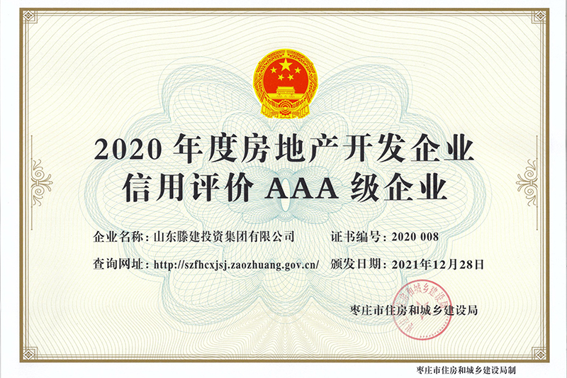 近期,棗莊市住房和城鄉建設局發布了2020年度全市房地產開發企業信用等級評定結果。山東滕建投資集團有限公司憑借在企業客觀信用能力、經營信用情況、社會信用等方面出色的綜合實力,榮獲2020年AAA級房地產開發企業最高信用等級。房地產開發企業信用評定是棗莊市住房和城鄉建設局依據《棗莊市房地產開發企業信用評價實施細則